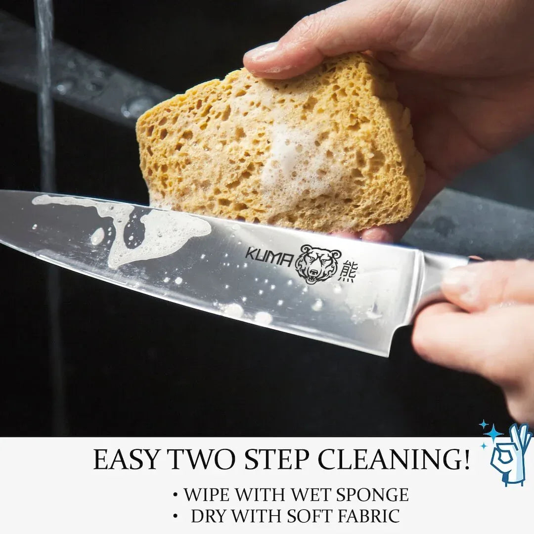 3Cr13 stainless steel for razor sharp, durable, easy to sharpen and semi rust resistant performance. KUMA recommends to wash all knives by hand with a soapy cloth and dry immediately.